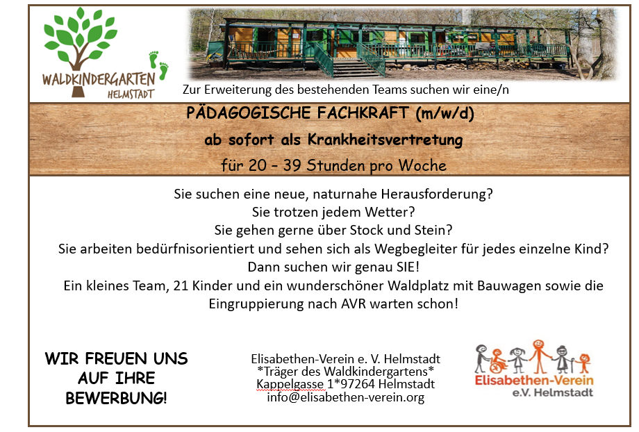 Ein kleines Team, 21 Kinder und ein wunderschöner Waldplatz mit Bauwagen sowie die Eingruppierung nach AVR mit Aussicht warten schon!