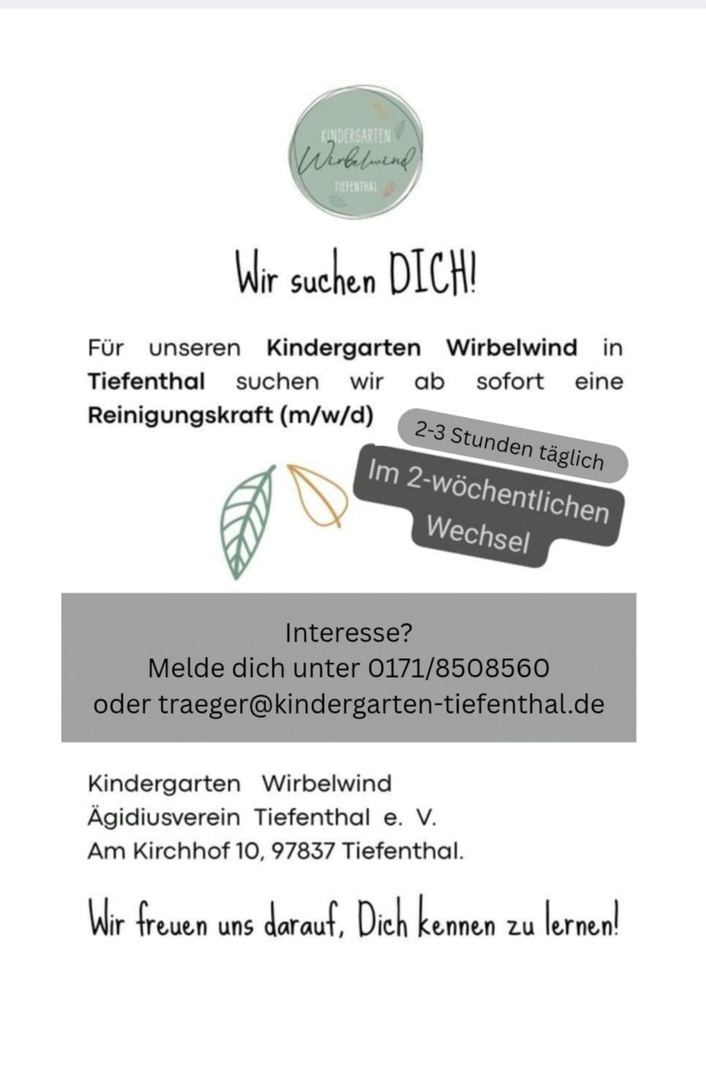 Für unseren Kindergarten Wirbelwind in Tiefenthal suchen wir ab sofort eine Reinigungskraft (m/w/d) für zwei bis drei Stunden täglich im 2-wöchentlichen Wechsel.